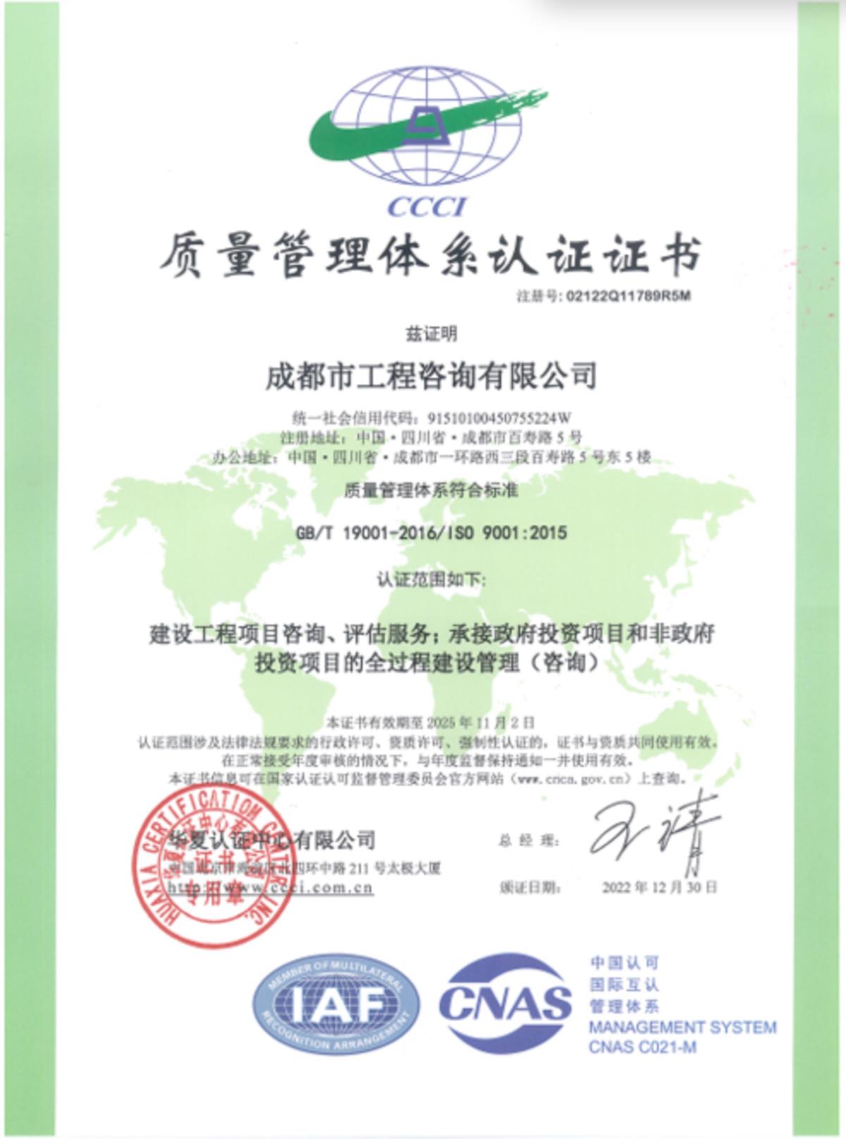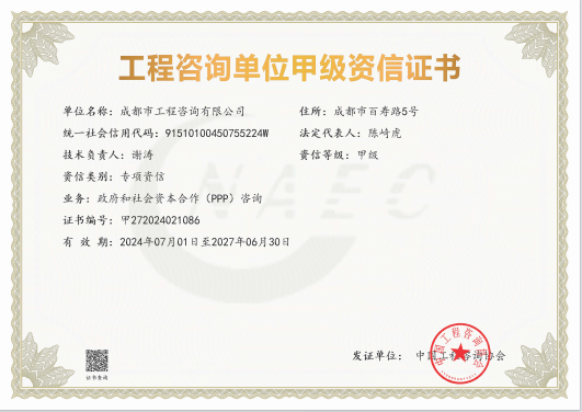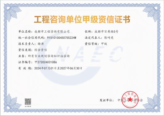 乐鱼(中国)拥有工程咨询甲级综合资信、甲级专业资信和PPP甲级专项资信三项甲级资信证书和工程造价资质。甲级综合资信由建筑,水利水电,农业、林业,电子、信息工程(含通信、广电、信息化),市政公用工程,生态建设和环境工程,公路,其他(节能)8个甲级专业资信和电力(含火电、水电、核电、新能源),轻工、纺织,水文地质、工程测量、岩土工程,建材,铁路、城市轨道交通,其他(土地整理)和其他(旅游工程)7个其他专业组成。乐鱼(中国)现已通过了GB/T19001-2016/ISO9001:2015质量管理体系、GB/T24001-2016/ISO14001:2015环境管理体系和GB/T45001-2020/ISO45001:2018职业健康安全管理体系认证。乐鱼(中国)目前是四川省内唯一同时持有甲级综合资信、甲级专业资信和PPP甲级专项资信证书的综合性咨询机构,是四川省及成都市发展改革部门以及天府新区、东部新区、高新区、武侯区等20余个区(市)县的政府投资项目咨询服务机构。