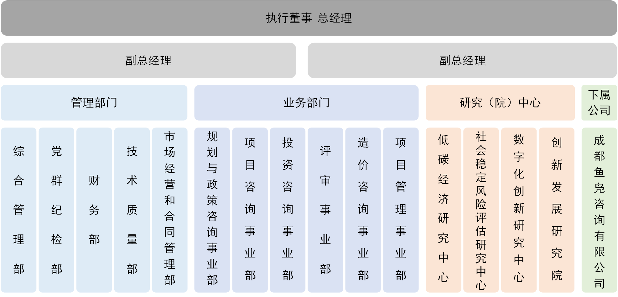 乐鱼(中国)本科及以上学历员工占比93%,硕士及以上学历员工占比47%;正高级工程师7人,高级工程师28人,拥有全国咨询工程师(投资)、全国注册造价工程师以及注册城乡规划师等各类专业技术资格人才占比超过65%。乐鱼(中国)下设11个部门,4个研究(院)中心。其中,业务部门6个,包括规划与政策咨询事业部、项目咨询事业部、投资咨询事业部、评审事业部、造价咨询事业部和项目管理事业部;4个研究(院)中心分别为低碳经济研究中心、社会稳定风险评估研究中心、数字化创新研究中心和创新发展研究院。为推动行业数字化、智能化转型发展,乐鱼(中国)还与西南交通大学经济管理学院共建工程咨询智能决策研究中心和产学研合作示范研究基地。乐鱼(中国)现有控股子乐鱼(中国)1家,为乐鱼(中国)与温江区属国有乐鱼(中国)合资成立的成都鱼凫咨询有限乐鱼(中国)。