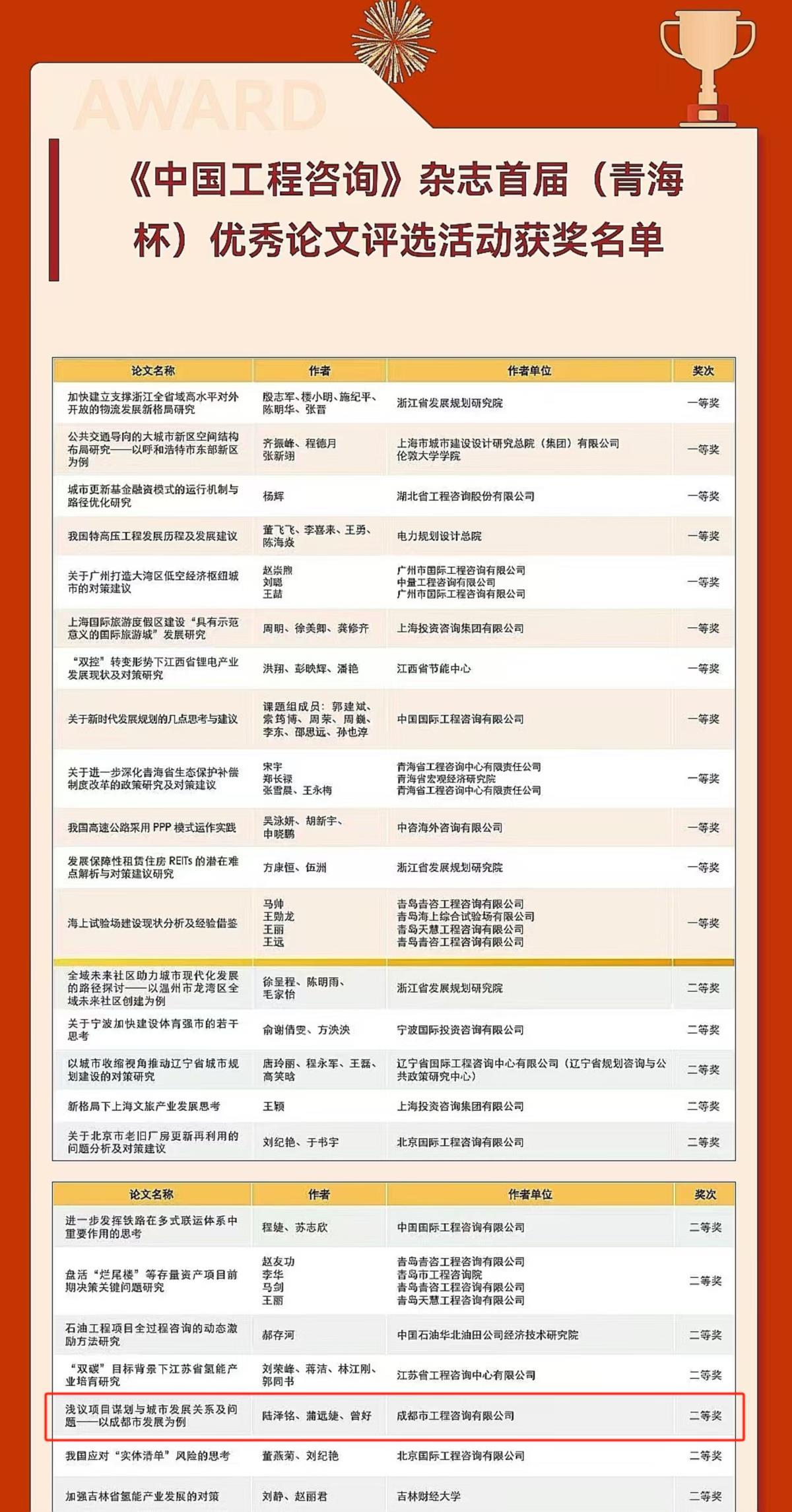 2024年8月7日,《中国工程咨询》杂志首届(青海杯)优秀论文评选结果揭晓。乐鱼(中国)乐鱼(中国)规划与政策咨询事业部陆泽铭、蒲远婕、曾好发表在2023年第11期的《浅议项目谋划与城市发展关系及问题——以成都市发展为例》一文在激烈的竞争中脱颖而出,成功获得本届优秀论文评选二等奖。