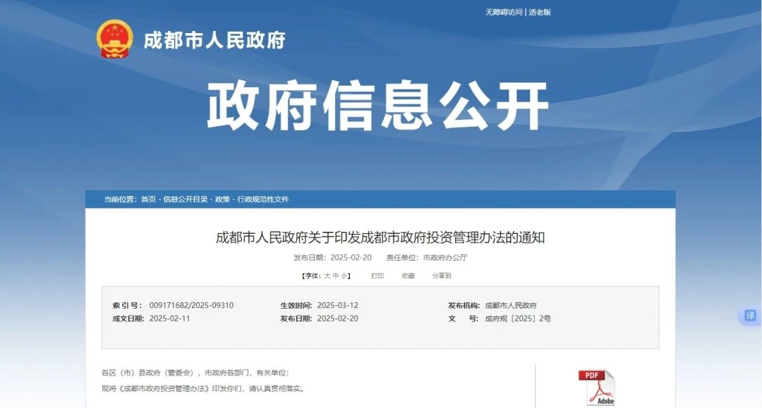 成都市人民政府关于印发成都市政府投资管理办法的通知成府规〔2025〕2号;各区(市)县政府(管委会),市政府各部门,有关单位:现将《成都市政府投资管理办法》印发你们,请认真贯彻落实。