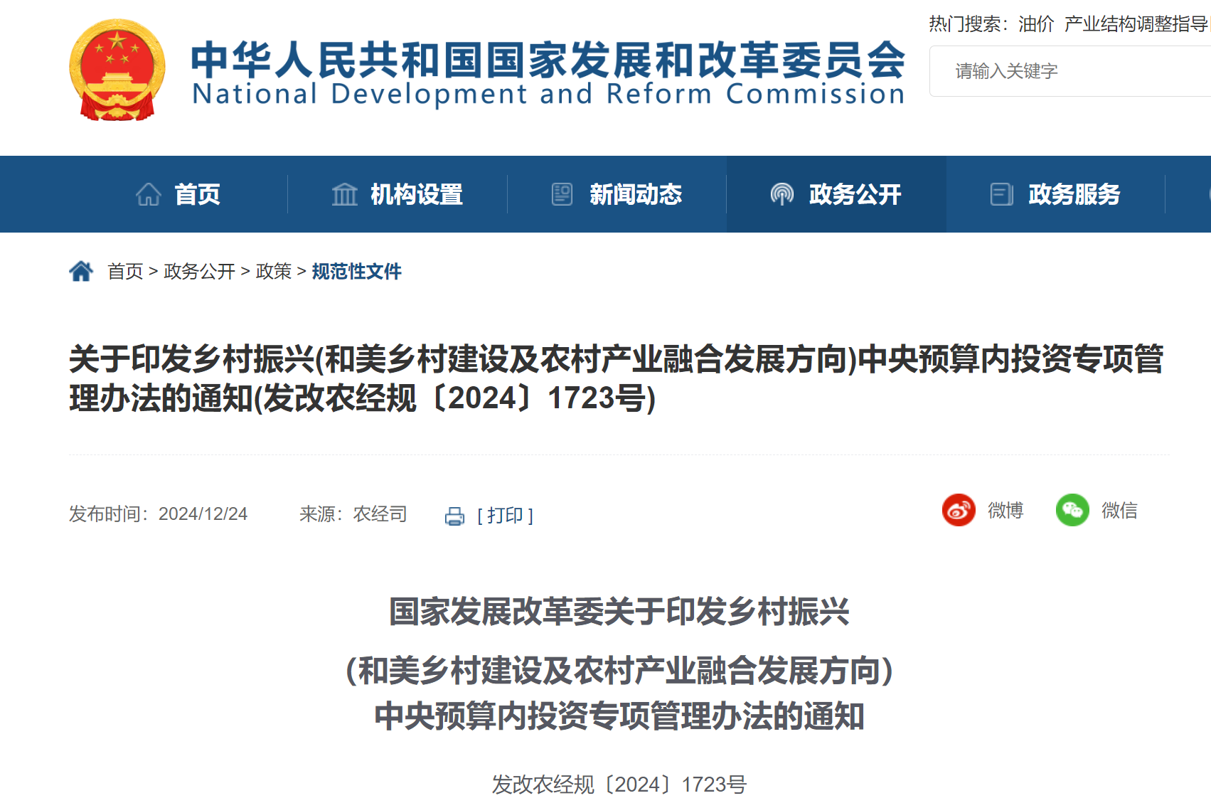 为贯彻落实党中央、国务院决策部署,进一步规范乡村振兴中央预算内投资专项管理,根据《政府投资条例》和中央预算内投资管理的相关规定,我们制定了《乡村振兴(和美乡村建设及农村产业融合发展方向)中央预算内投资专项管理办法》。
